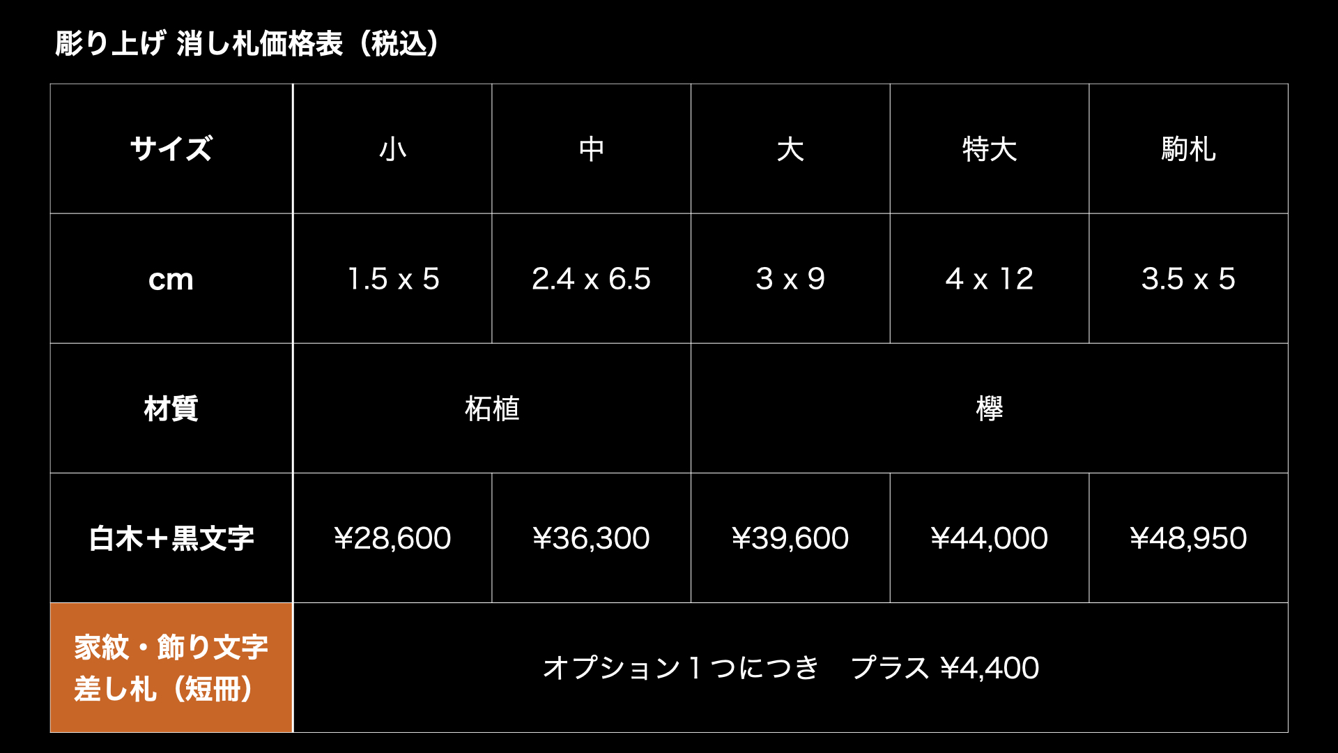 レーザーで彫り上げた札に、丁寧に手加工を加え、漆を重ね塗りした特製の「消し札」です。より厚みを増した漆の手触りと光沢は、多くのお客様にご満足をいただいております。家紋、代紋、纏、飾り文字、短冊などのオプションも承ります。